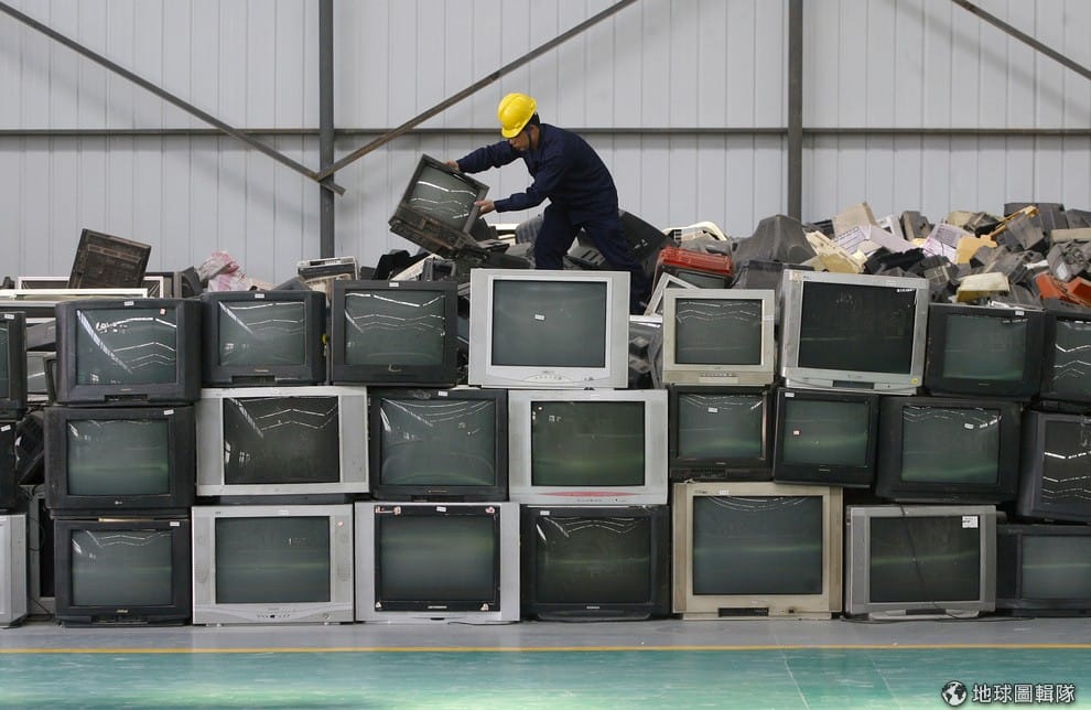 一名工人正在將廢棄電視整理,進行回收,舊物廢棄對於環保來說也是無形的打擊。