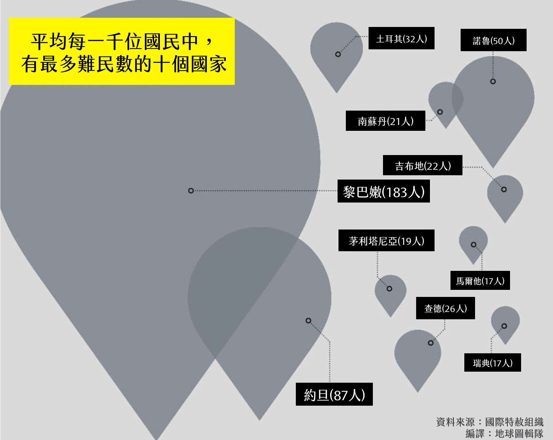 黎巴嫩與紐西蘭、愛爾蘭的人口數相近,在 2015年接受了 110萬名敘利亞難民,但紐西蘭只接收了 250位敘利亞難民,愛爾蘭則接收了 758位敘利亞難民。