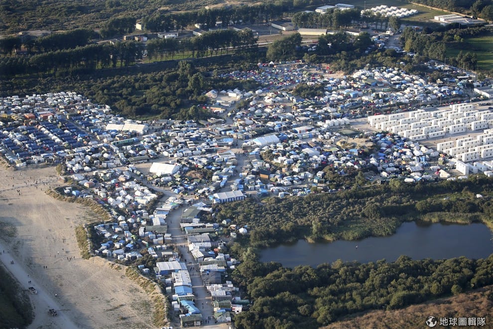 圖為法國加萊市內有「叢林」之稱的難民營空拍樣貌,由於這個難民營擴展得越來越迅速,法國總統歐蘭德(Francois Hollande)在最近宣布會解決加萊市的狀況,也引發難民與聲援者抗議。