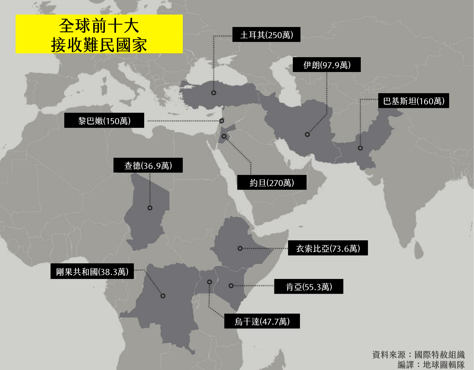 根據國際特赦組織的資料,前十大收容難民的國家分別是約旦(270萬人)、土耳其(250萬人)、巴基斯坦(160萬人)、黎巴嫩(150萬人)、伊朗(97.9萬人)、衣索比亞(73.6萬人)、肯亞(55.3萬人)、烏干達(47.7萬人)、剛果共和國(38.3萬人)與查德(36.9萬人)。