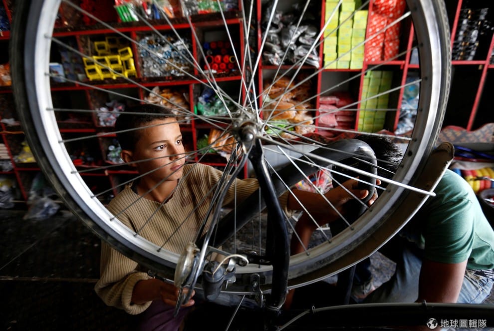 一名敘利亞難民在約旦的難民營裡頭,幫忙修理腳踏車賺錢。