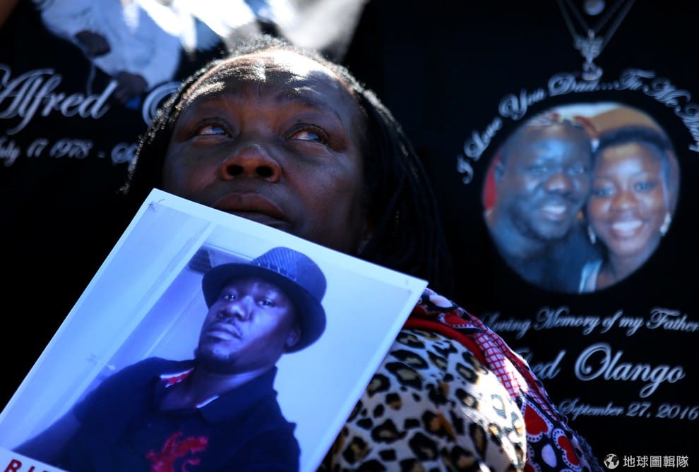 一名黑人女子手拿近日在加州遭警方擊斃的烏干達移民奧蘭戈(Alfred Olango)照片,上街表達警方濫殺黑人的憤怒。