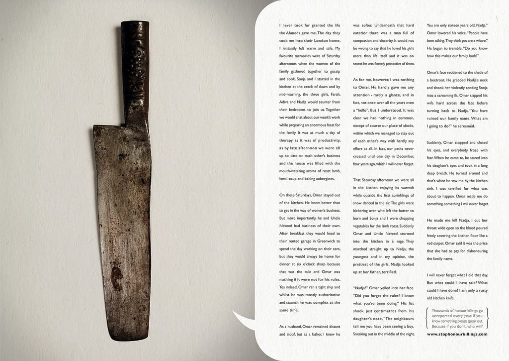 圖中用刀子的角度描述了丈夫用它榮譽處決妻子的情況,並在文末寫到:「我永遠不會忘記我當時作了什麼。但是我能做什麼、能說什麼呢?我只不過是一支老舊的廚房刀。」