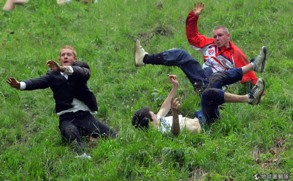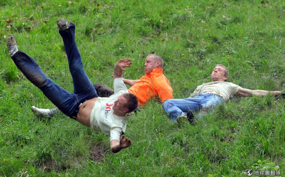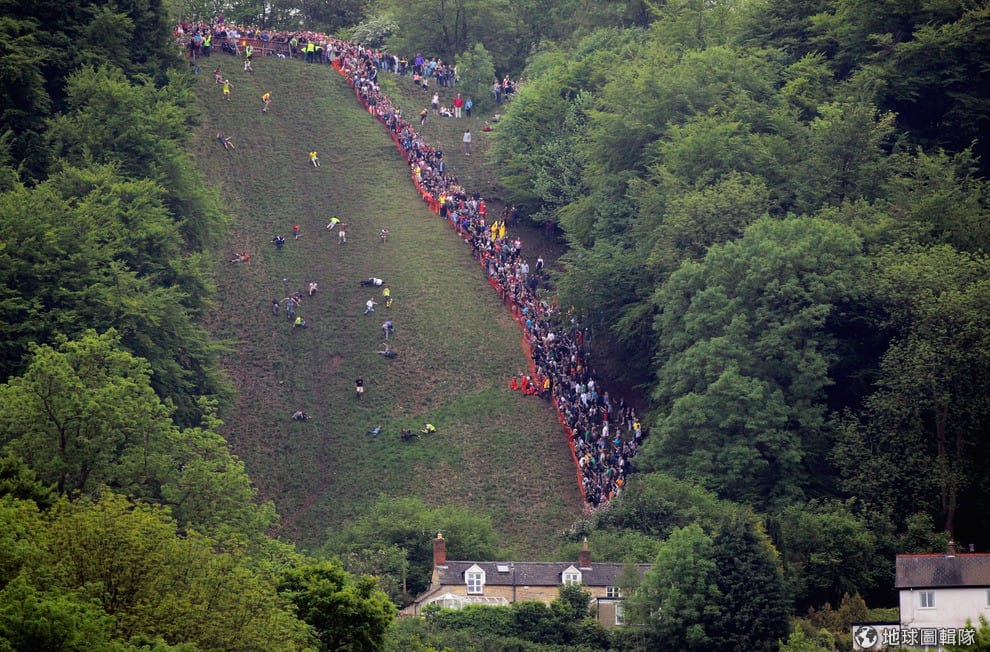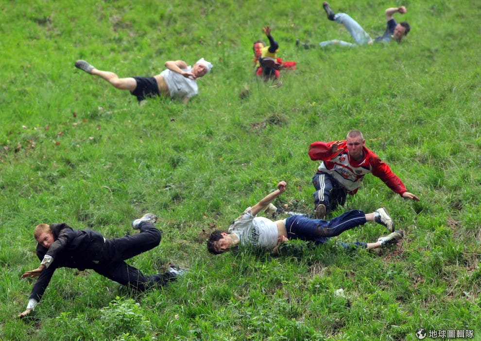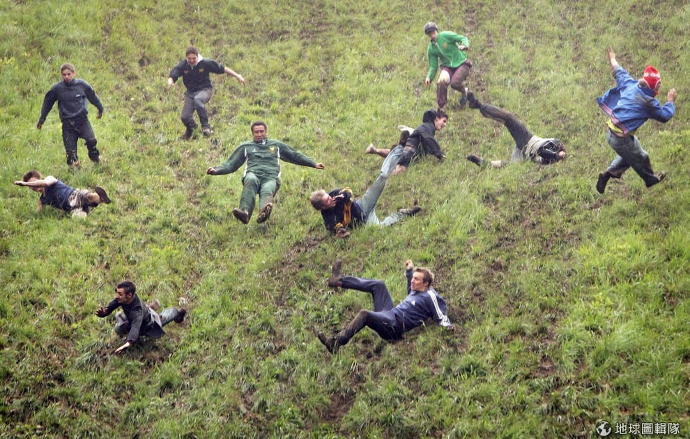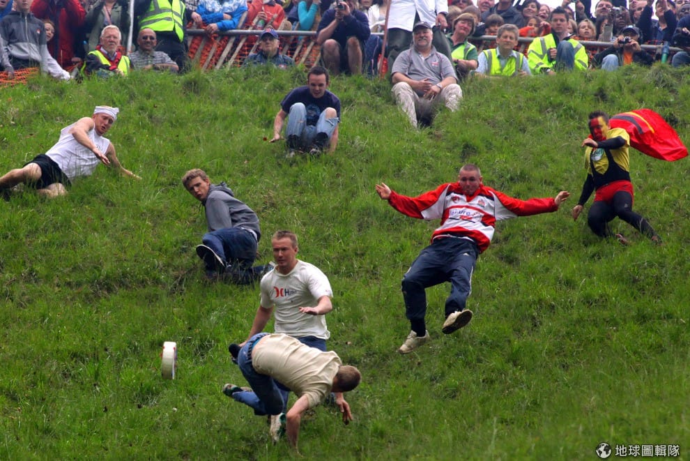 gettyimages每年5月下旬,英國的庫柏山丘(Cooper's Hill)上會辦起讓人看得目瞪口呆的「滾起司大賽」(Cheese-Rolling and Wake),只見主持人一聲令下,參賽者們全開始追著一塊圓滾滾的起司往山下衝,但因為山丘的坡度近乎垂直,所以到最後不只是滾起司,站不穩的參賽著也開始連滾帶爬的跟著起司一起往山下滾!