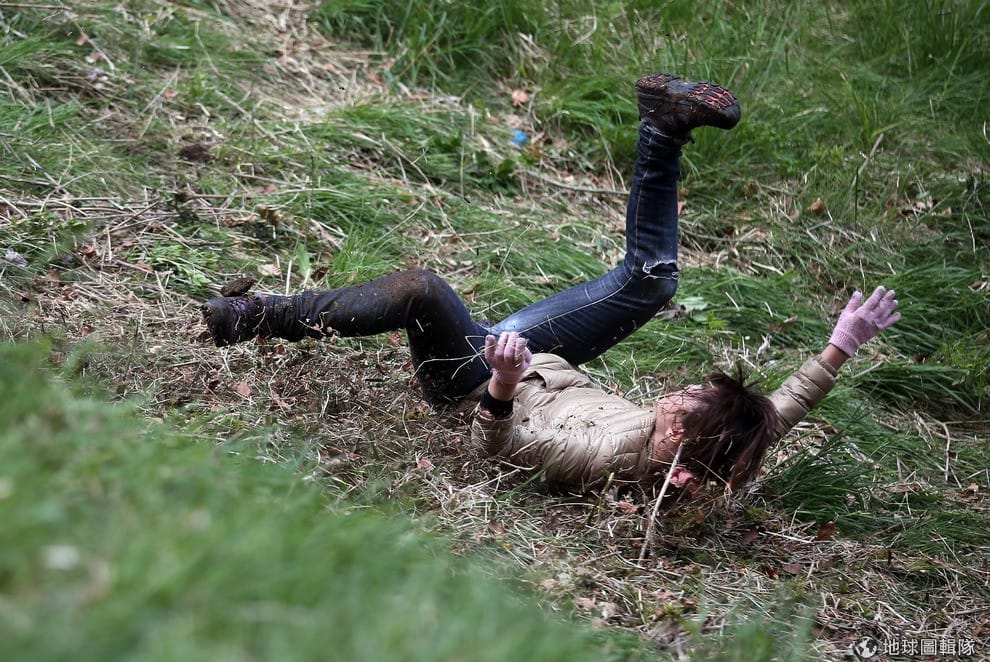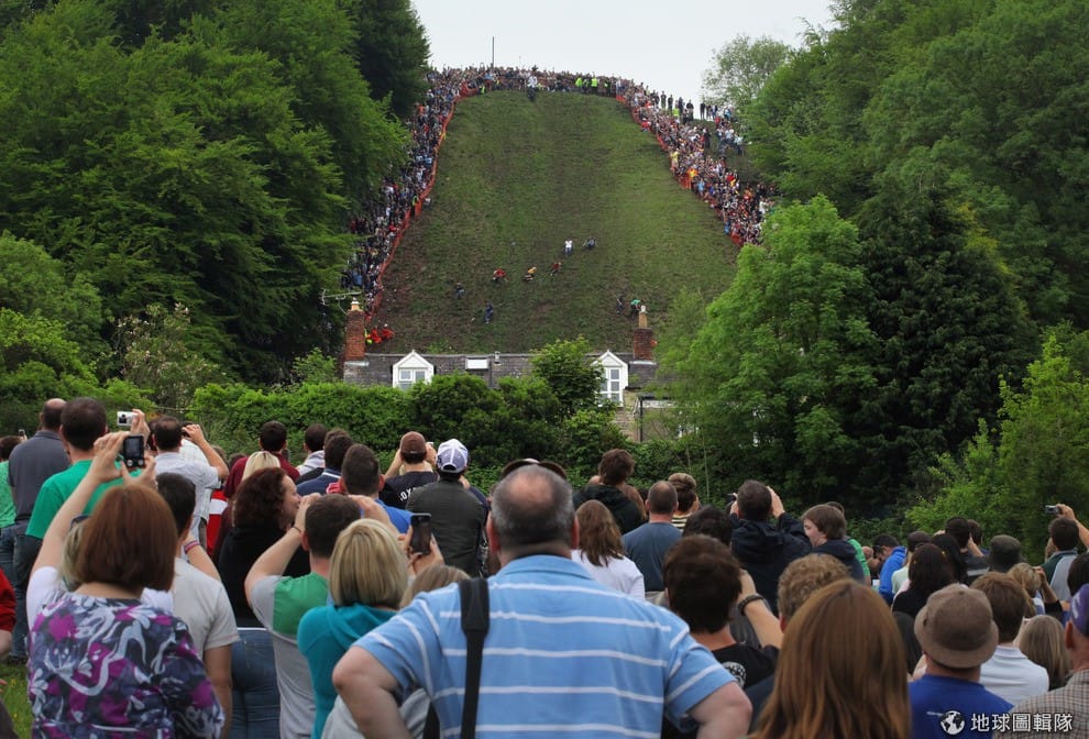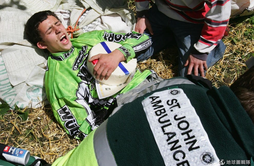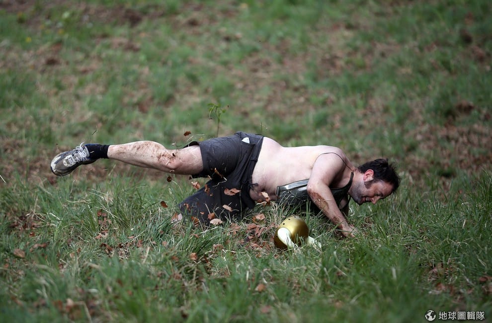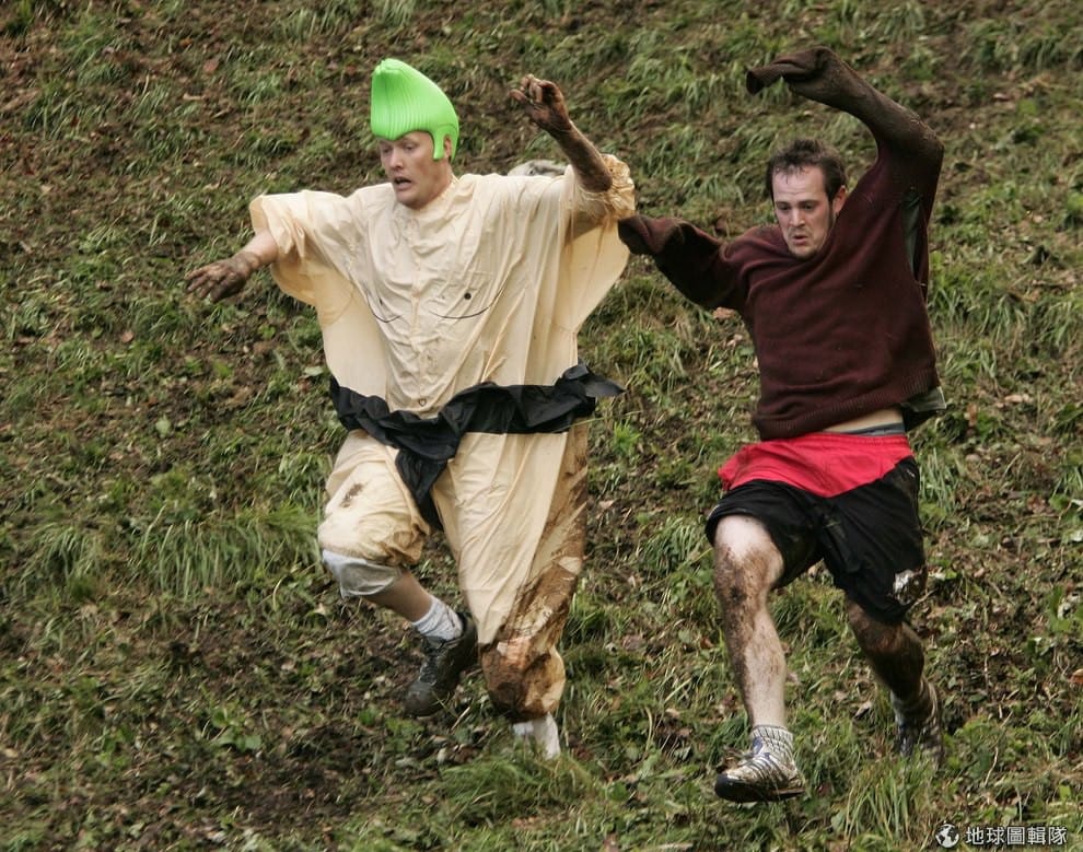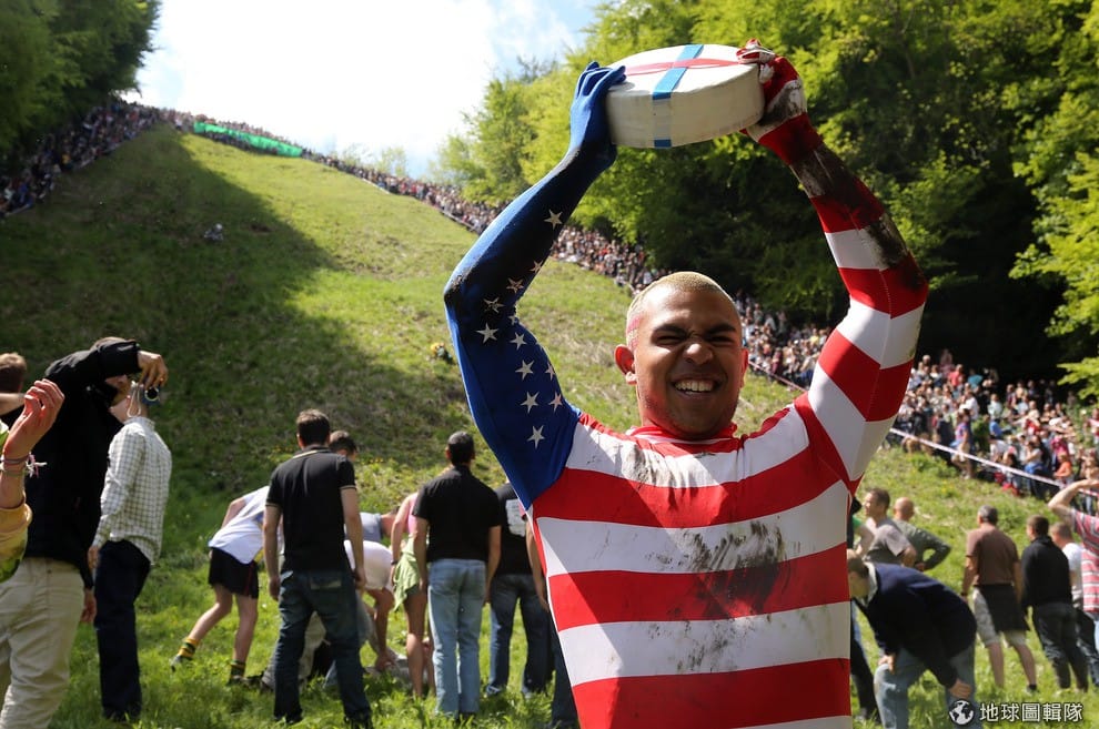 gettyimages每年5月下旬,英國的庫柏山丘(Cooper's Hill)上會辦起讓人看得目瞪口呆的「滾起司大賽」(Cheese-Rolling and Wake),只見主持人一聲令下,參賽者們全開始追著一塊圓滾滾的起司往山下衝,但因為山丘的坡度近乎垂直,所以到最後不只是滾起司,站不穩的參賽著也開始連滾帶爬的跟著起司一起往山下滾!