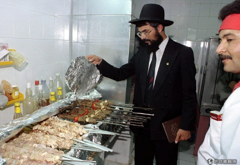 一名猶太教拉比正在檢查廚師如何料理食物,有沒有符合嚴格的潔食規範。