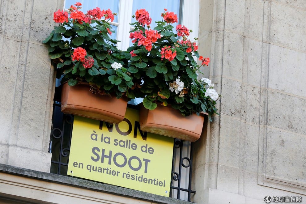 路透社在巴黎安全吸毒室附近的建物上,反對成立吸毒室的民眾掛上了一面寫有「不准吸毒室設在住宅區」字樣的牌子。