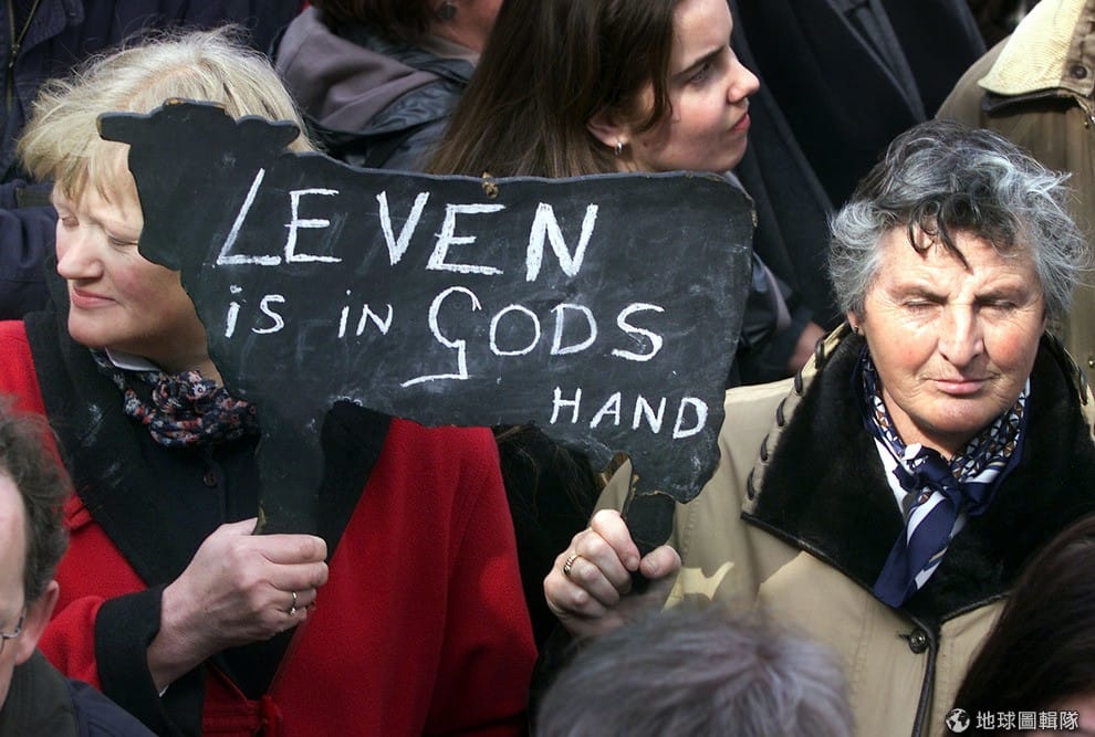 2001年,反對安樂死合法化的民眾上街抗議,他們舉起寫有「生命在上帝手中」字樣的牌子。