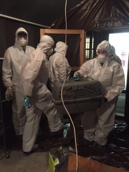 救援人員進入古普勒斯的屋舍救援動物時,必須全副武裝抵擋惡臭味,但即使隔著過濾面罩也聞得到。