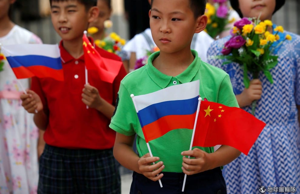 為了與美國抗衡,俄國與中國在國際舞台上越走越近。圖為今年六月俄國總統普亭出訪中國時,路旁孩子們舉著兩國國旗歡迎普亭。