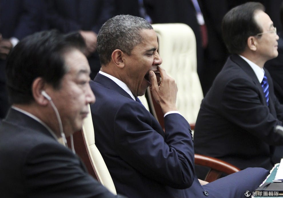 大腦重量不同的動物,哈欠長度也不同。根據研究,人類在哺乳類動物中哈欠最長,平均可以超過 6秒。圖為美國總統歐巴馬(Barack Obama, 中)在打哈欠時,被一旁的鏡頭捕捉下來。