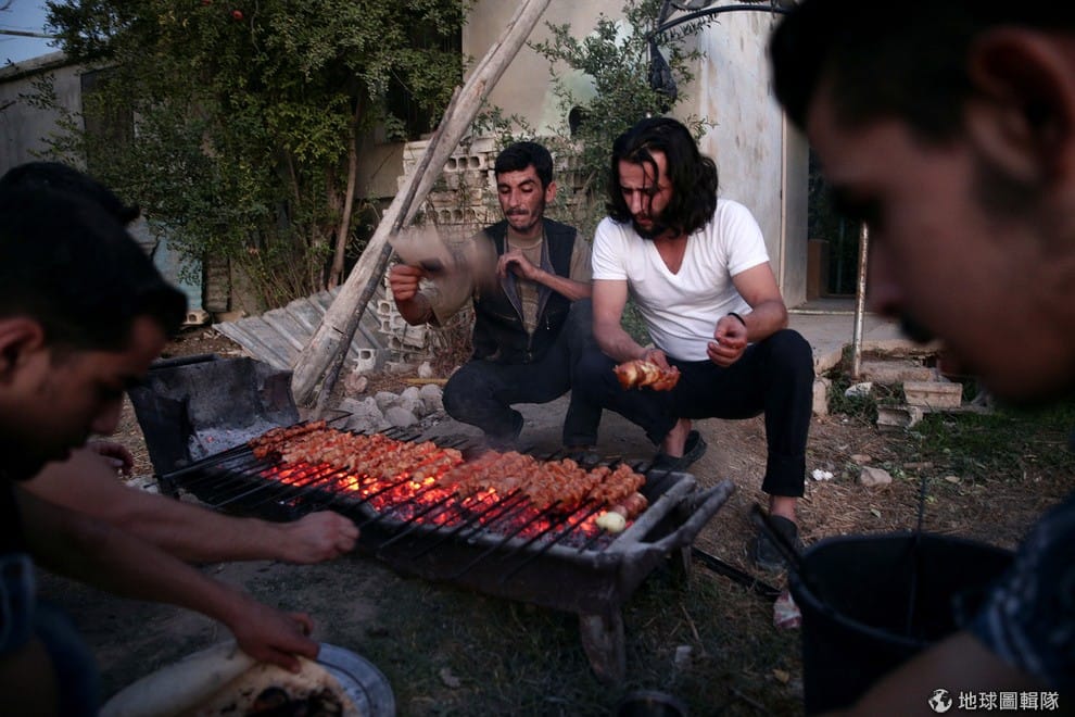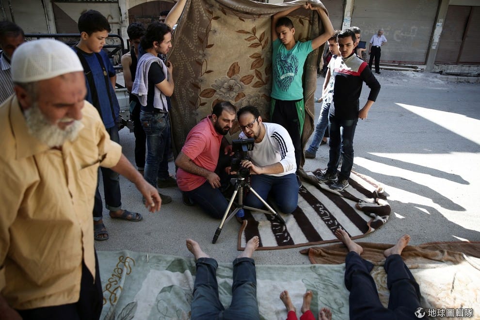 被圍城的城鎮內資源非常稀少,什麼都得自己來。導演後面的男孩們用人工的方式架起擋光用的棉被。