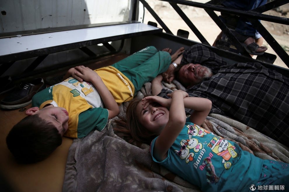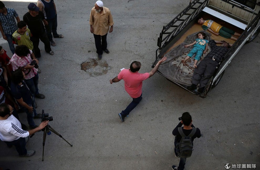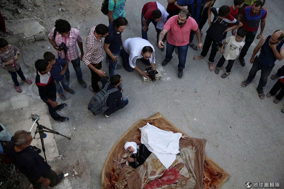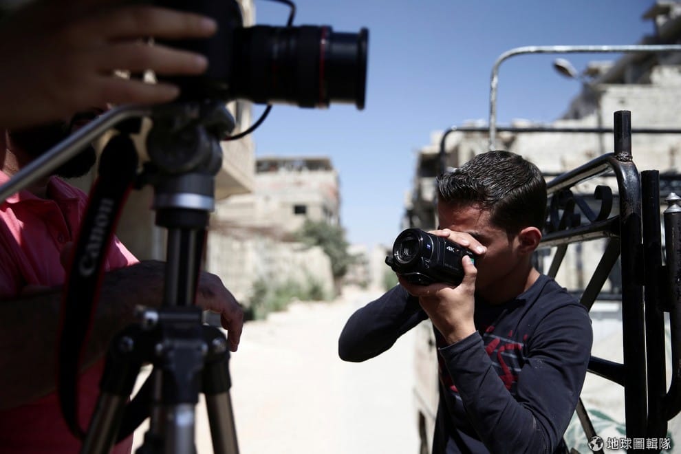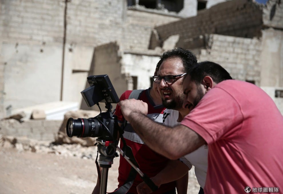 路透社導演胡薩里(右)與攝影師山米(Sami al-Shami,中間)正在調整拍攝與取景角度。