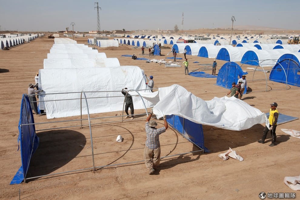 路透社一些從摩蘇爾城逃出的人民已經被安置到聯合國難民署所設置的難民營,照片中人們紛紛前去領取物資。