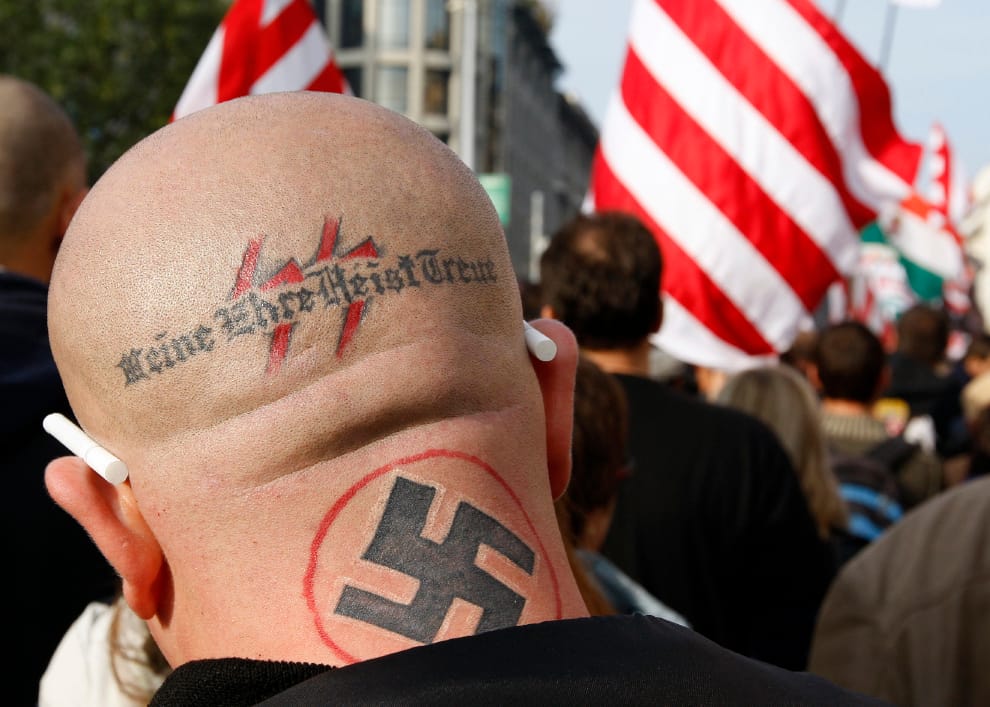 2016年2月,匈牙利布達佩斯的新納粹分子上街慶祝他們的「榮譽之日」,這天是納粹德國的黨衛隊,從蘇聯包圍的布達佩斯突破重圍的日子。