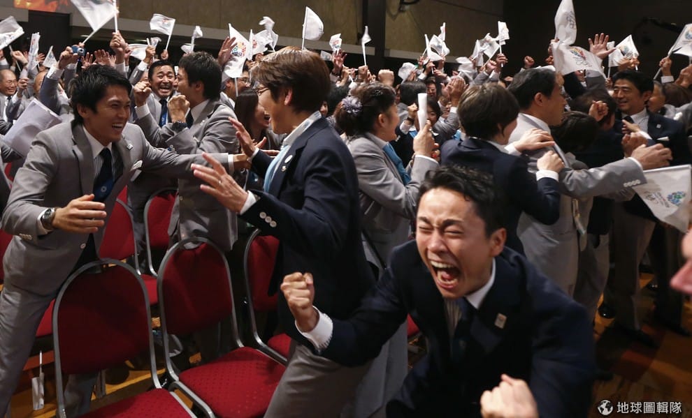 圖為 2013年東京團隊申奧成功的畫面。當時在競爭資格的時候,東京都政府表示在東京灣比賽建划船場地只需要約 9,500萬美元(折台幣約 30億1,026萬元),現在卻飆升到 4億8,400萬美元(折台幣約 153億3,651萬元)。
