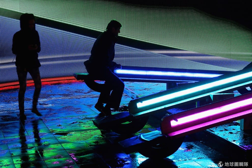 遊客正開心地玩著燈光蹺蹺板。Cameron Spencer/Getty Images