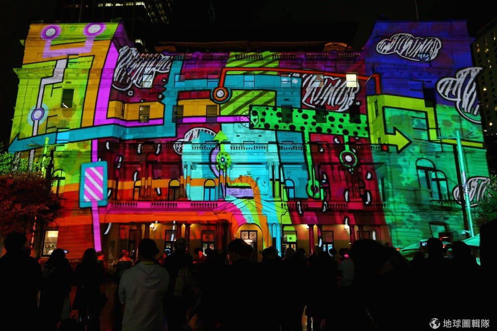 雪梨的海關大樓外牆也成為最佳畫布,可愛的卡通線條把海關大樓化為另種活潑的氣氛。Cameron Spencer/Getty Images