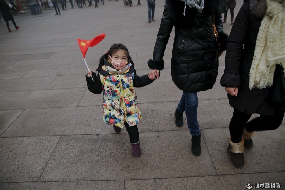 小女孩手拿著中國國旗,跟著家人一起參觀紫禁城。由於重男輕女的風氣,中國的性別比一直有很嚴重的偏差。
