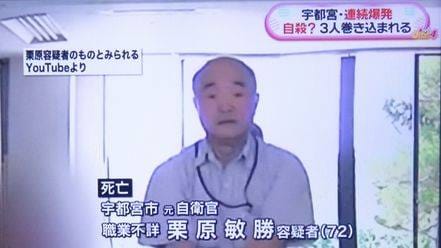死者是今年 72歲的退休自衛隊成員栗原敏勝,他也是犯下這起自殺爆炸案的嫌犯。這起爆炸案也造成 64歲和 58歲的兩名男性被爆炸的碎片刺傷,還有一名 14歲的少年受到輕傷。