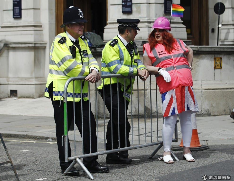 一名參加同志大遊行的民眾在一旁和維持秩序的警察聊天。對有些人來說如果得到道歉,其實他們可以連赦免都不要。