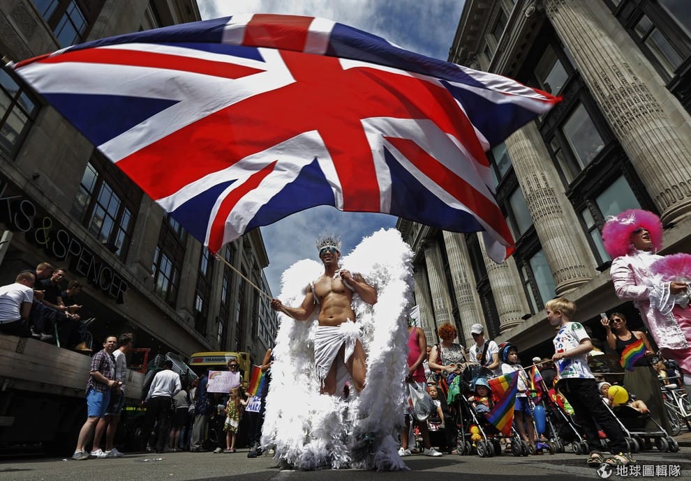 一名男子在同志遊行上揮舞著英國國旗。隨著時間演進,英格蘭和威爾士在 1967年宣佈,以兩方同意為基礎,且雙方的年紀都超過 21歲,那麼同性性行為就不算犯罪,蘇格蘭與北愛爾蘭則分別在 1980年與 1982年跟進。一直到 2001年,英國政府再次修法,將合法性行為年紀降到 16歲,這條規範不論是異性戀或是同性戀通通適用。