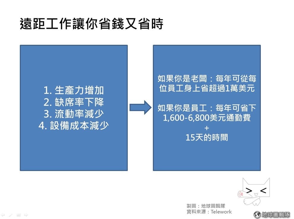 不只老闆可以省錢,不用把錢花在租借辦公室上,遠距工作的員工同樣可以省下交通費。