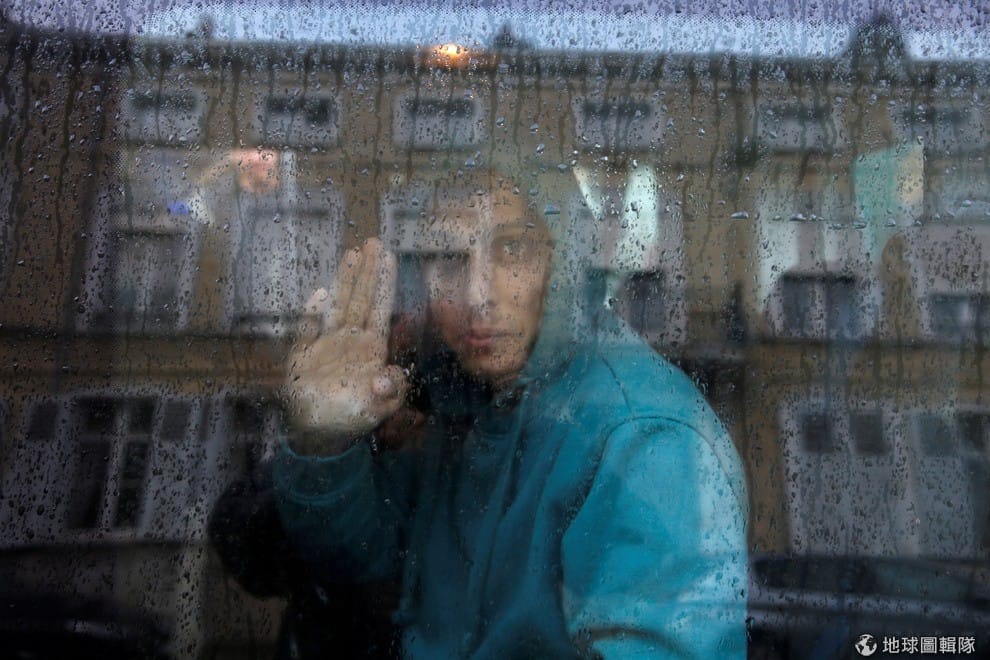 一名阿富汗青年正在向窗外的人們揮手道別,無親無故的他們會被送往英國安置。