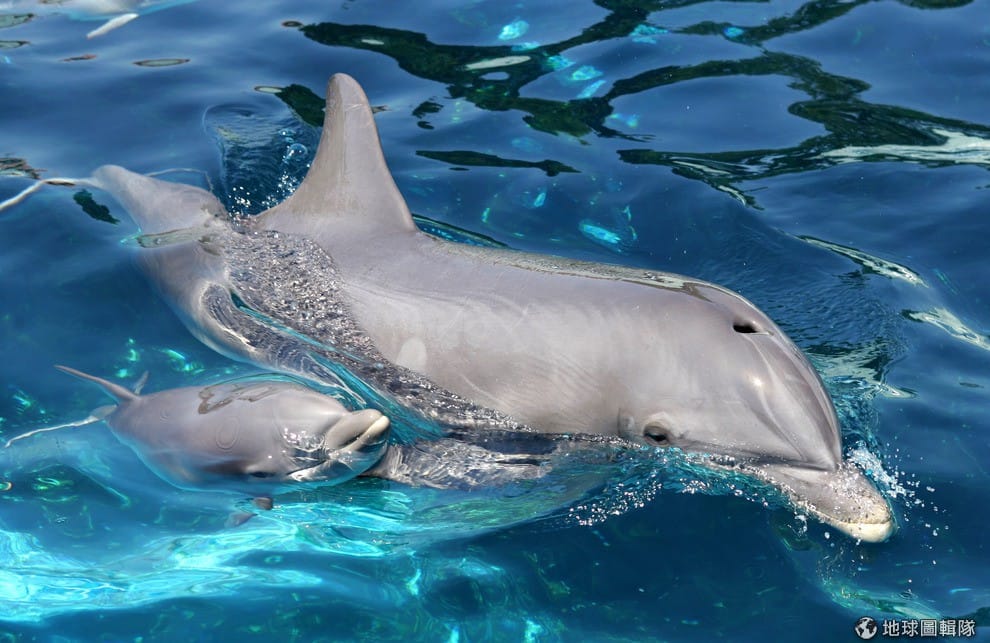 海豚媽媽在小海豚出生前,口哨聲會越吹越頻繁,而同水池的海豚會變得比較安靜,以不混淆小海豚接受哨聲。 取自coralreefphotos.com
