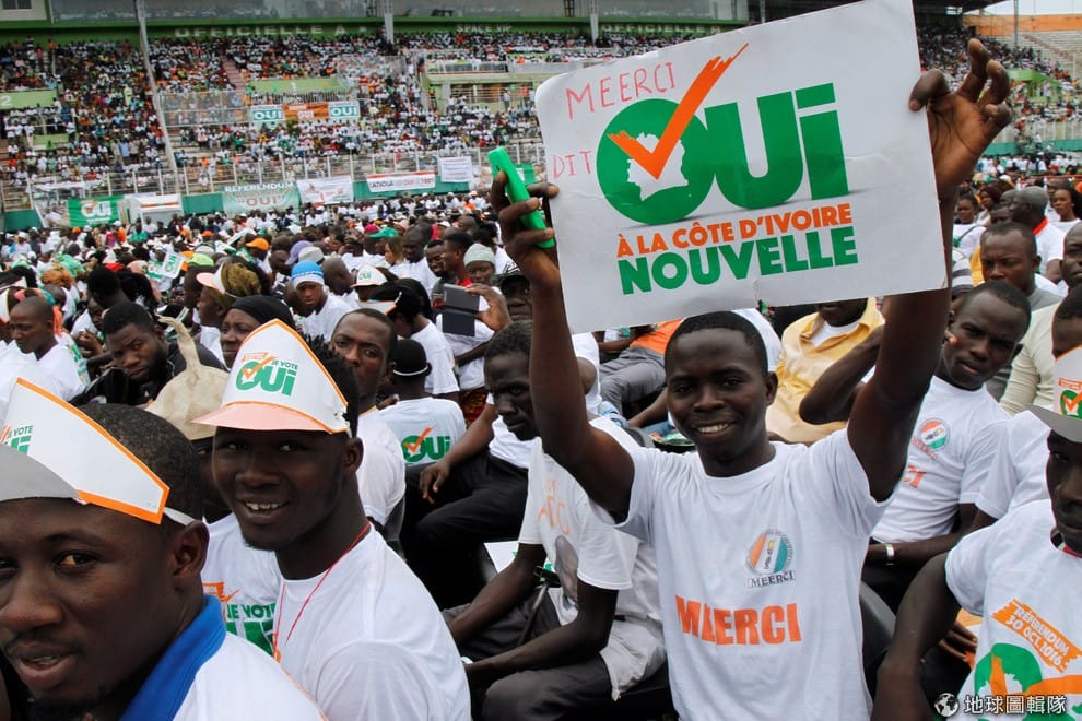圖為青年發展排行倒數第三的象牙海岸,年輕人政治參與度高,他們高舉標語支持新憲公投。