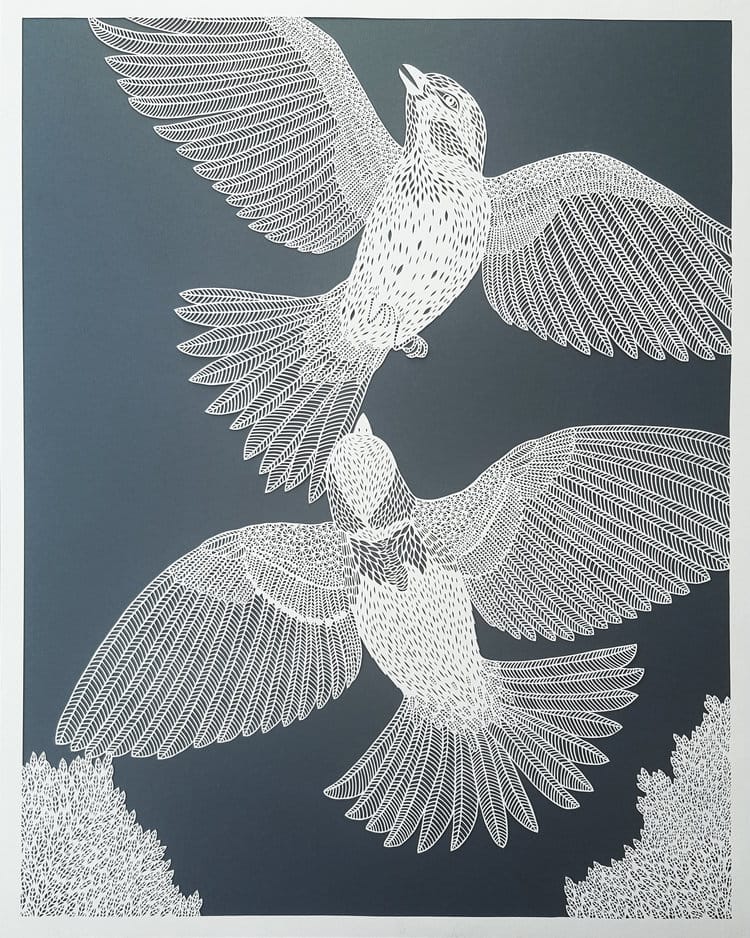 戴拉嘉釋出的影片裡,記錄下她如何小心翼翼地完成作品,也展現了她素描的好功夫還有精細的刀工。待作品完成後翻過來就是美麗的鳥兒。