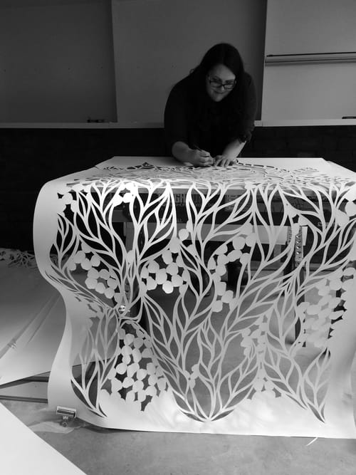 網友PIPPA DYRLAGA圖為英國剪紙藝術家戴拉嘉,她正趴在桌上創作一幅大型的剪紙作品。