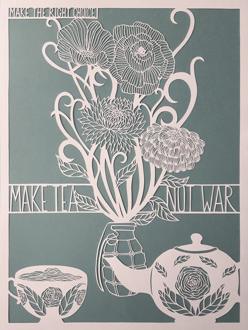 網友PIPPA DYRLAGA生活中離不開茶的戴拉嘉,也用剪紙藝術呼籲大家不要戰爭只要茶。