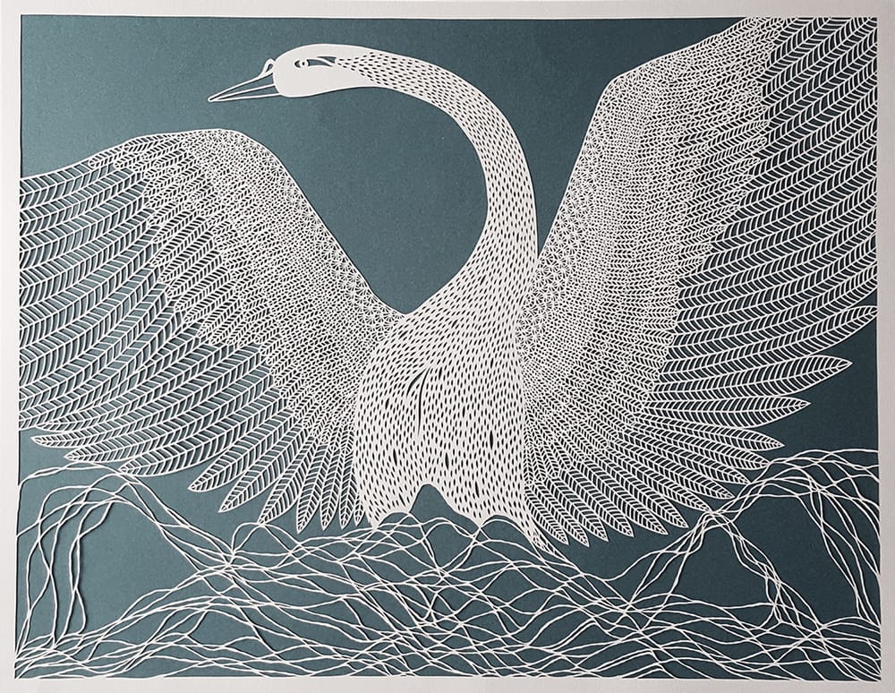 天鵝的羽毛根根分明,剪紙藝術家戴拉嘉表示,有時一幅作品要花上一百小時慢慢雕琢。
