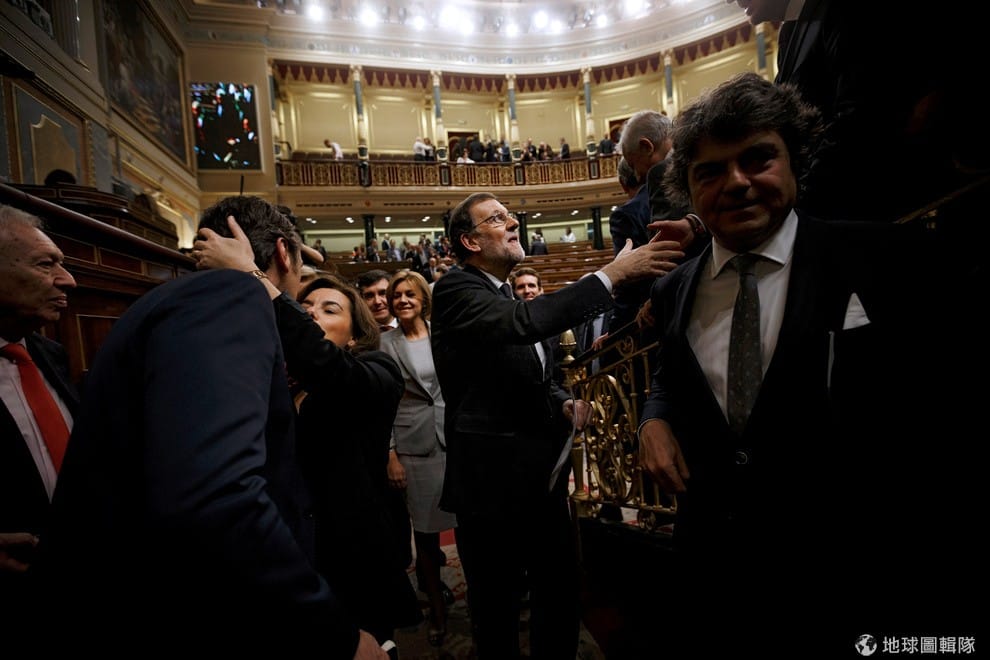 西班牙首相拉霍伊(Mariano Rajoy,畫面中間)贏得了國會信任投票,將再次出任西班牙總理。