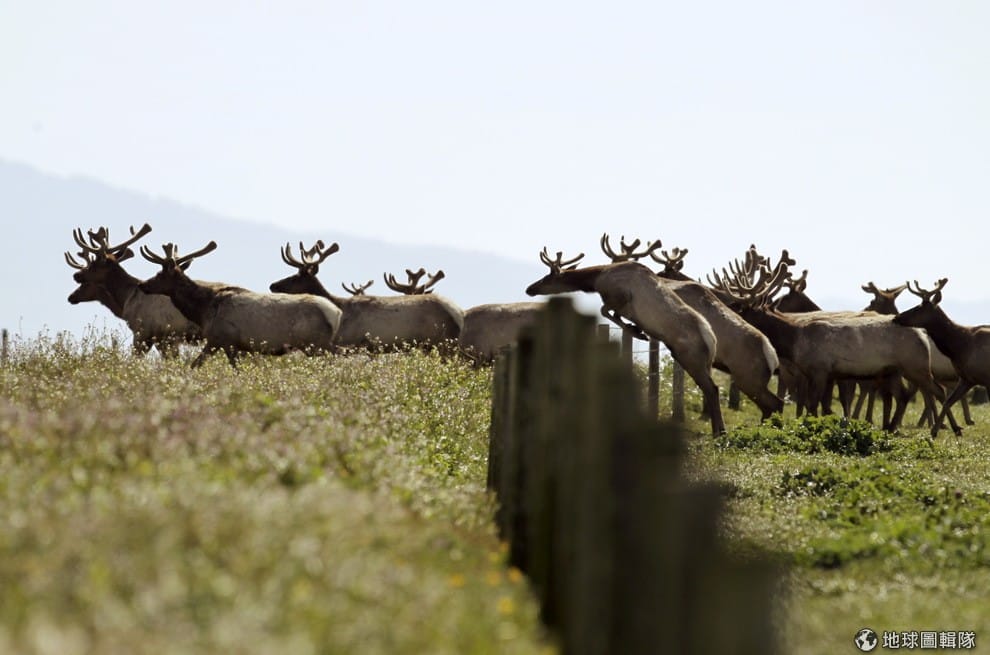 圖片拍攝於 2015年4月的美國雷斯岬國家海岸公園(Point Reyes National Seashore),加拿大馬鹿群輕巧地跳過柵欄尋找食物。當時發生旱災,農民希望可以設置圍欄限制鹿群的行動範圍,如此一來自家的牲畜就不需要跟牠們爭取食物,但這個想法遭到動物權益倡議者大力反對,有人指出,採取這個作法的公園已經害死了大量的加拿大馬鹿。
