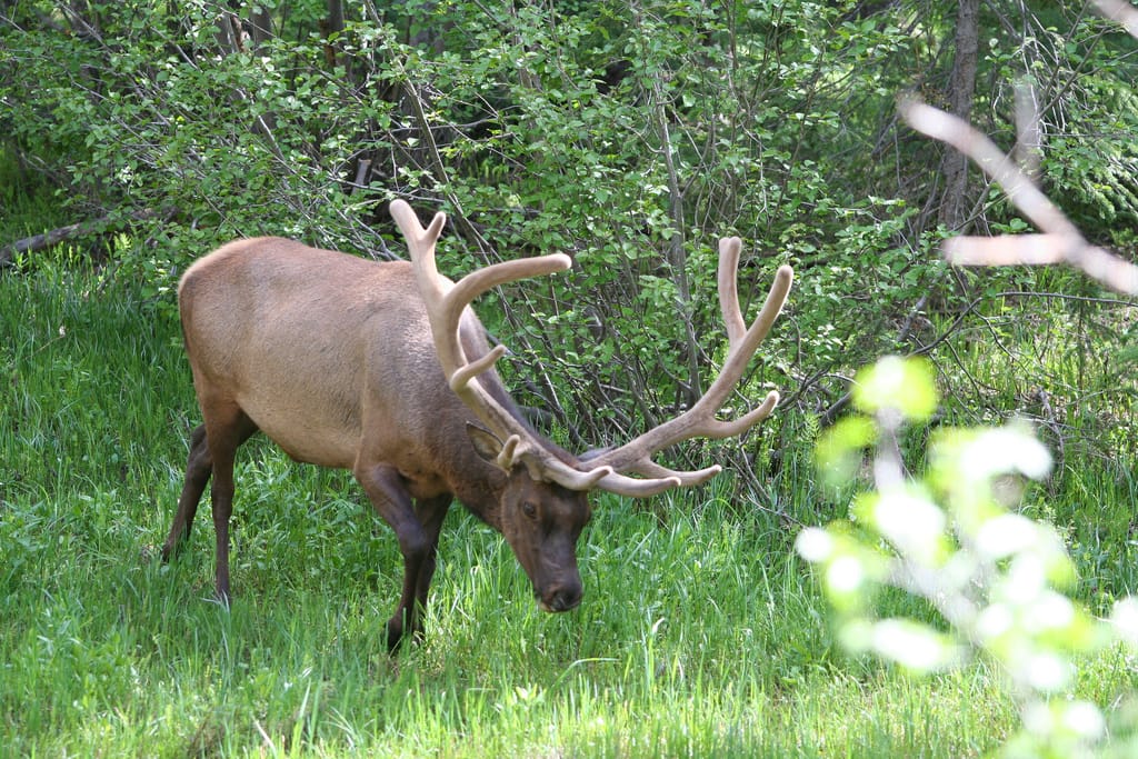 一隻加拿大馬鹿在加拿大的洛磯山國家公園(Rocky Mountain National Park)覓食,過去美國黃石公園過多的加拿大馬鹿,讓當地的植被幾乎遭到摧毀。