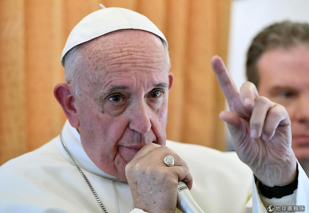 圖為教宗方濟各在飛機上舉行記者會的畫面,在出訪的回程班機上召開記者會已經變成例行傳統。
