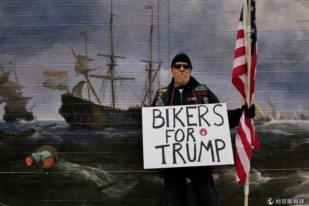 一名美國民間軍人團體「愛國者騎士」(Patriot Guard Riders)的成員「pocket」,手上拿著聲援川普的牌子。