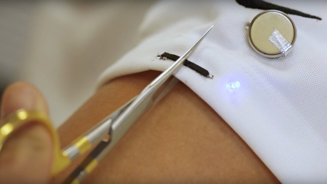 影片中可以看到,附著在衣物上的穿戴式電子裝置原本能成功通電讓小燈泡發亮,但被剪刀一剪就斷了電,可是不出幾秒,擁有自癒能力的磁性墨水發威,將斷裂的部分連接起來,又成功讓燈泡亮了起來。