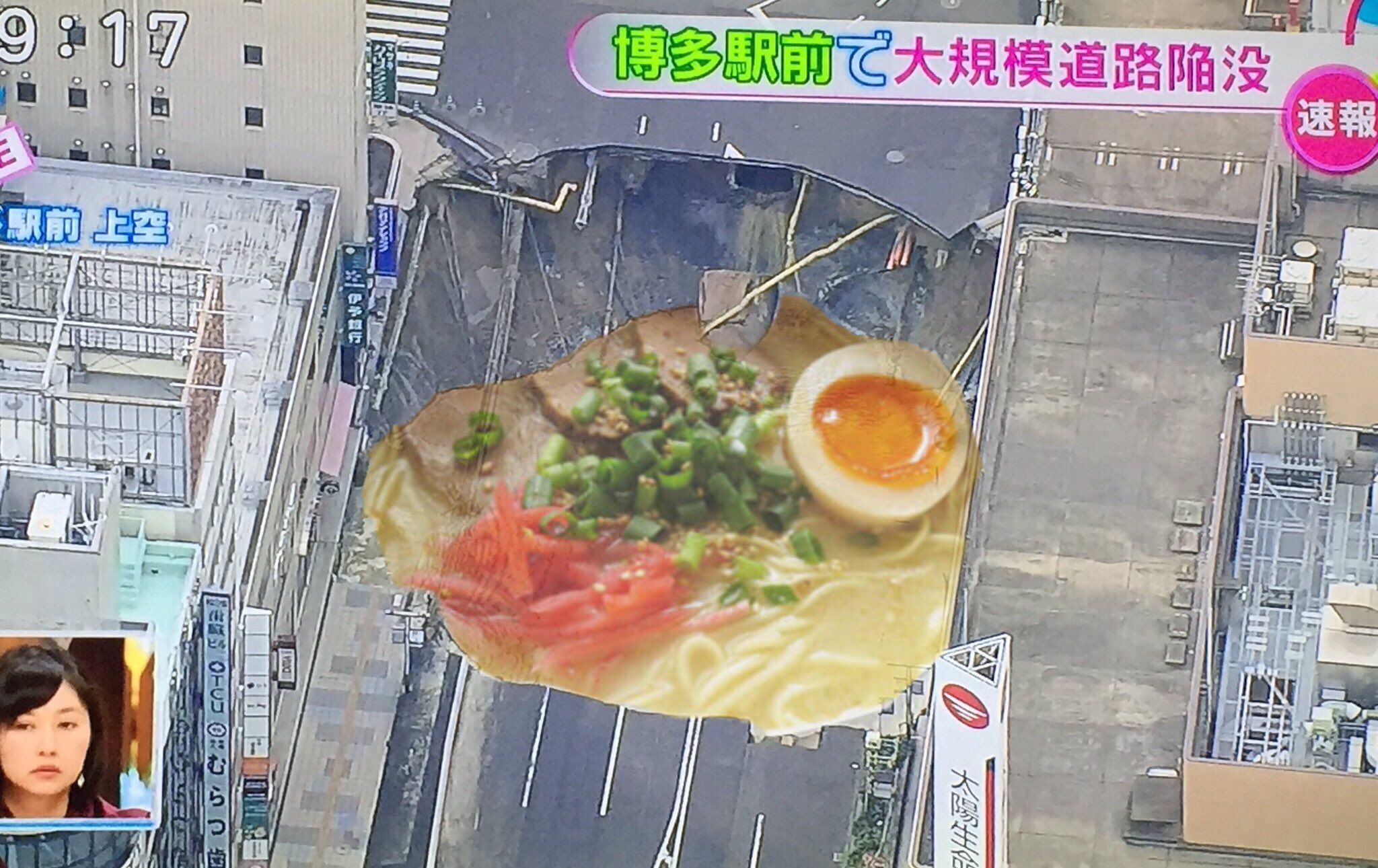 網友仲西大地博多著名的豚骨拉麵也來參一腳,填滿了塌陷的大洞,讓人會心一笑。
