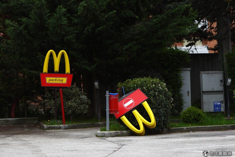 圖片拍攝於 2009年,當時某家義大利的麥當勞招牌因為地震被震倒在地上。