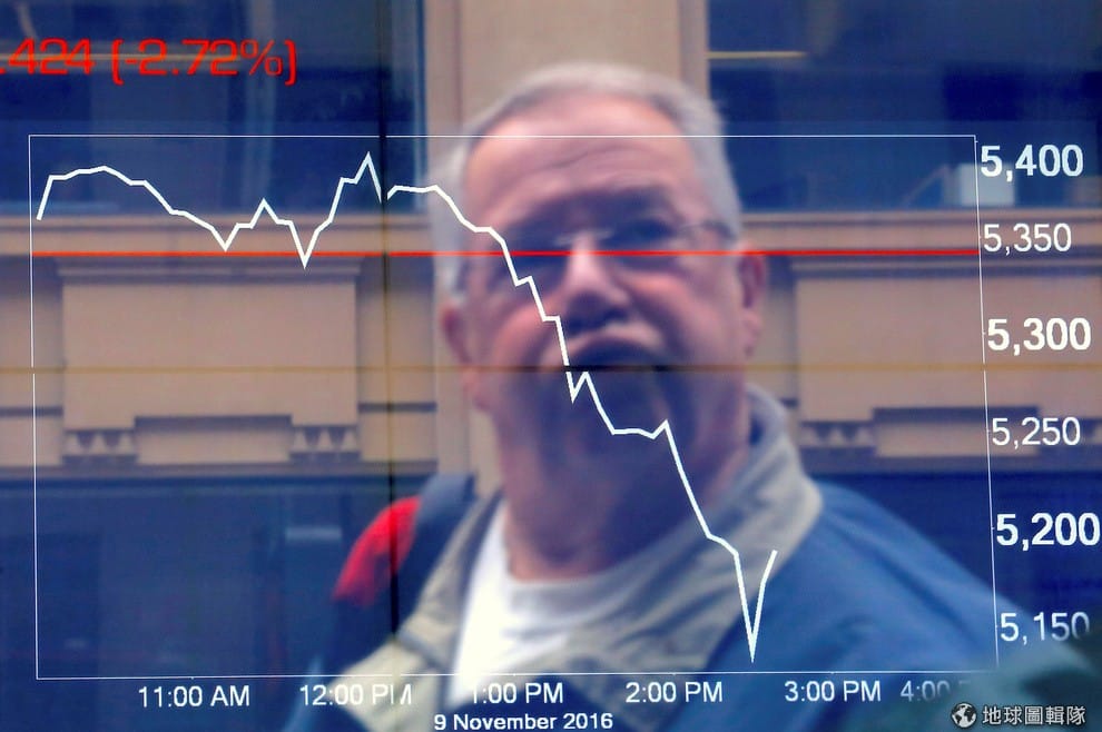 路透社然而,川普的當選讓投資人心慌,各國股市都不約而同出現嚇人的重挫,圖為澳洲證交所情況。