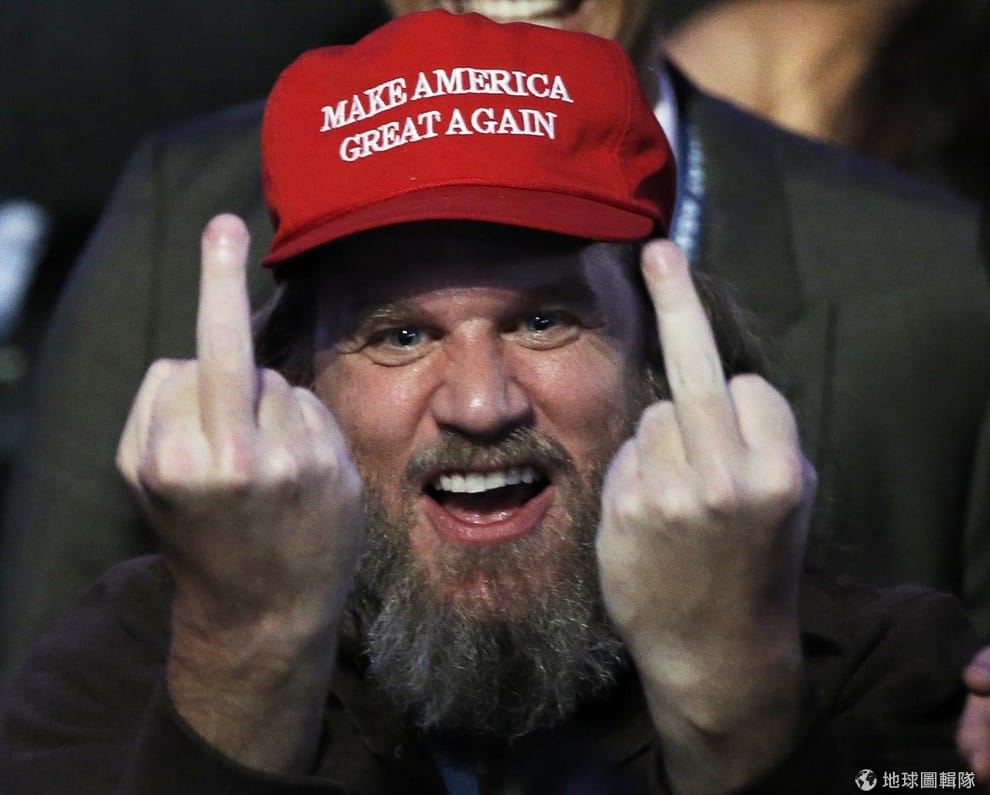 路透社川普的支持者頭上戴著寫有「讓美國再次偉大」字樣的招牌紅帽,對著鏡頭比出中指展現內心的澎湃。