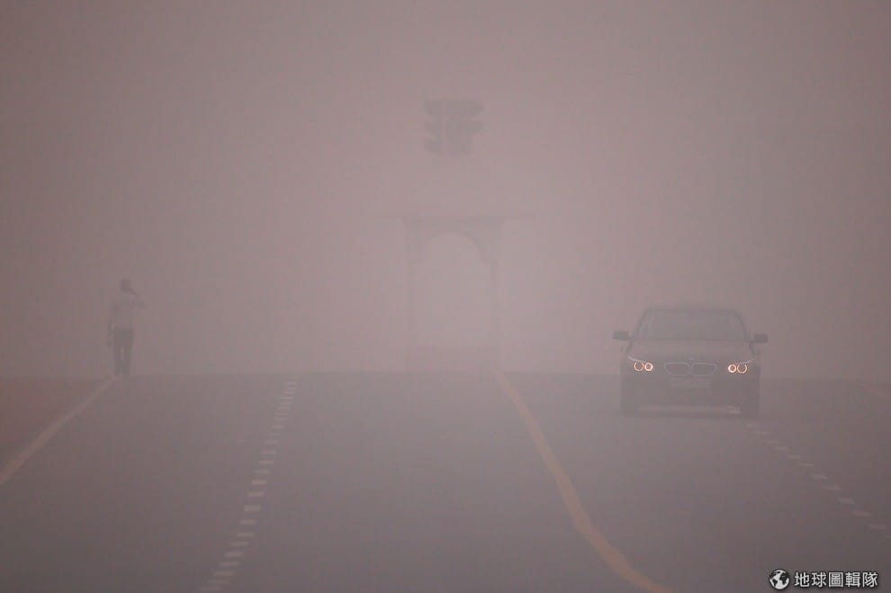 圖為印度德里 11月初遭受霾害時的畫面,當時能見度只有前方 200公尺,讓路人提心吊膽,車禍意外也頻頻發生。