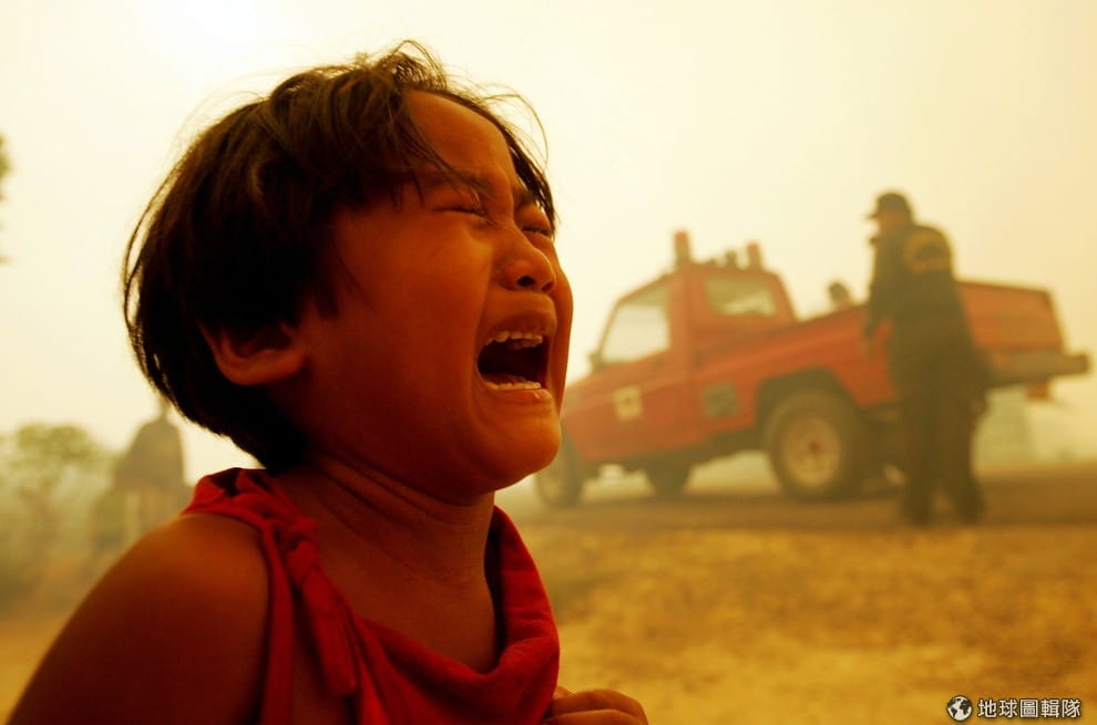 在印尼森林大火造成的霧霾中,一名小女孩不得不跟隨家人撤離家園。