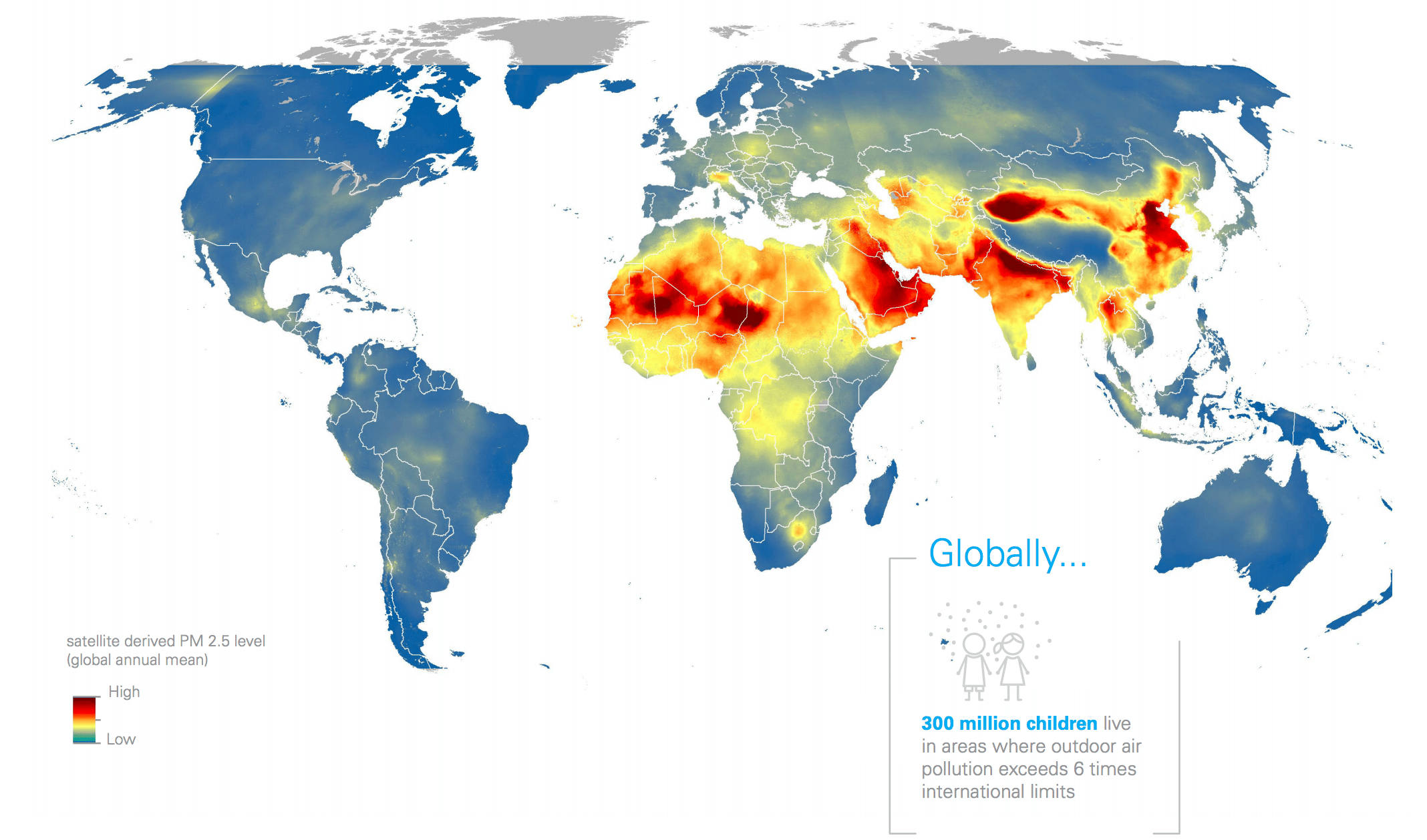 路透社圖為報告內以懸浮微粒數據(PM 2.5)為標準,標示出空污嚴重的國家分布。根據UNICEF調查,南亞約有 6億2,000萬名孩童生活在糟糕的空氣環境裡頭,再來分別是非洲(5億2,000萬名)、東亞與太平洋區域(4億5,000萬名)。