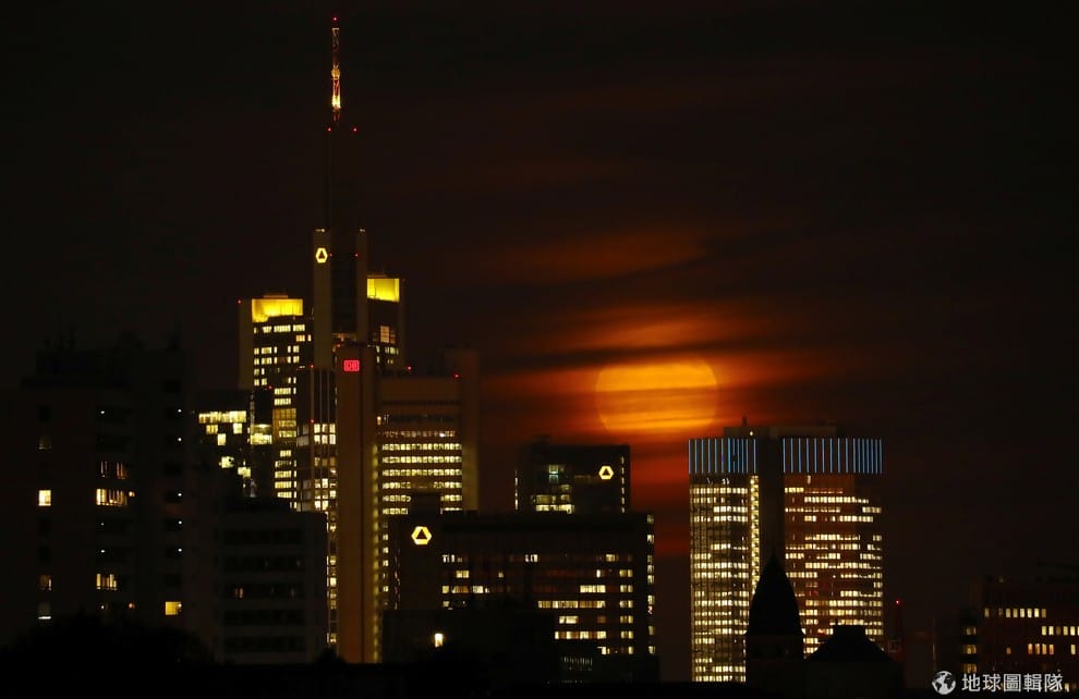 路透社圖拍攝於德國,宛如落日的景象其實是剛升起的月亮呢!