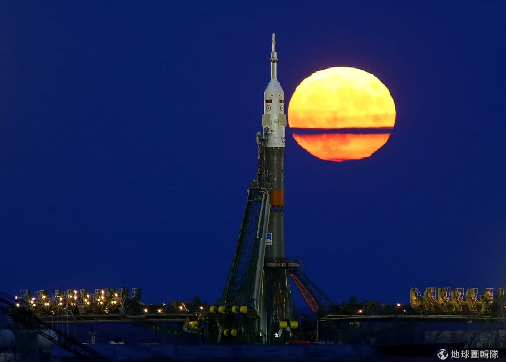 在哈薩克的太空基地上,太空船Soyuz MS-03正準備發射前往國際太空站,讓背後的月亮呈現燃燒一般的畫面。