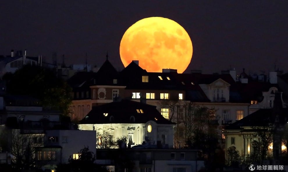 路透社超級月亮來的這天,月球緩緩地從捷克市鎮升起,兩相比起來真的格外巨大。